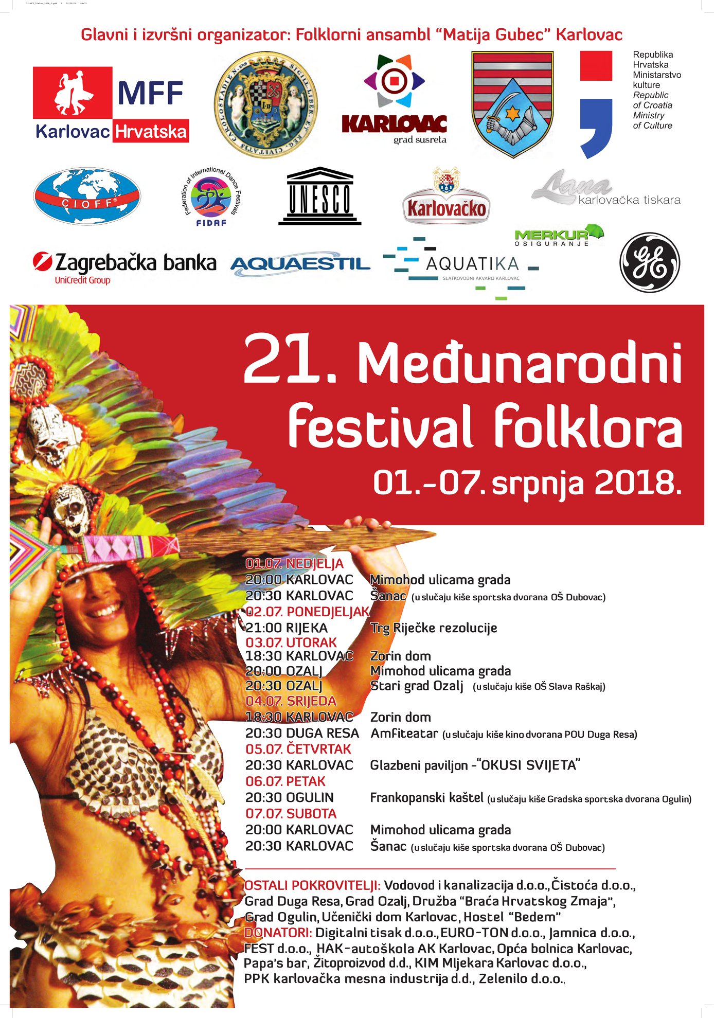 Karlovački Međunarodni festival folklora počinje 1. srpnja, a tijekom sedam dana Festivala gostujući folklorni ansambli predstavit će tradicijske pjesme i plesove Perua, Indije, Finske, Kenije i Filipina.