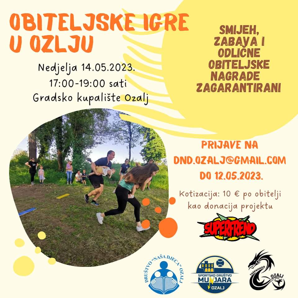 U nedjelju, 14.05.2023. godine na kupalištu u Ozlju održat će se OBITELJSKE IGRE U OZLJU od 17:00 -19:00 sati u organizaciji Društva Naša djeca Ozalj, Taekwondo kluba Ozalj te Sportskog društva Munjara Ozalj.