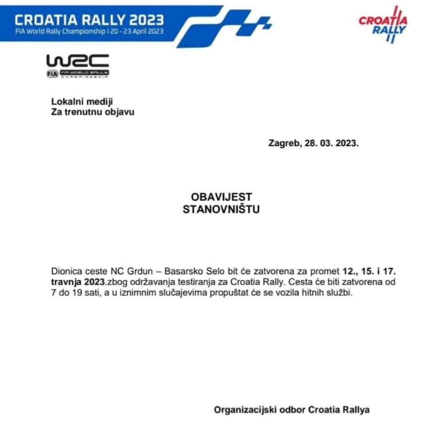 U danima 12., 15. i 17. travnja 2023. godine u vremenu od 07:00h do 19:00h odvijat će se privremeno zatvaranje prometa na dionici NC Grdun – Basarsko selo zbog obavljanja testnih/probnih vožnji za WRC momčadi. Obilazni pravac će biti na relaciji Jaškovo/Poljaki – Završje Netretičko/Piščetke i obratno.