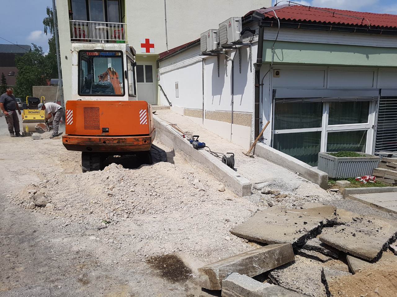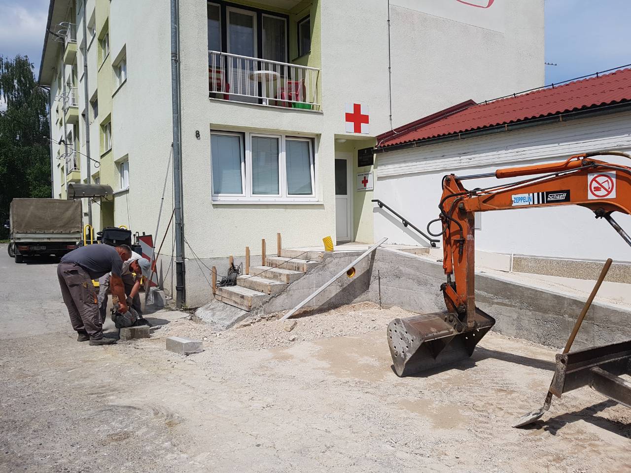 U tijeku su radovi uređenja parkirališnog mjesta za osobe s invaliditetom i uređenju kolnog i pješačkog pristupa stambeno – poslovnoj zgradi koju koriste Crveni križ Ozalj i Centar za socijalnu skrb Ozalj, Kurilovac 8.