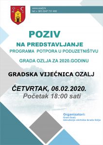 U suradnji sa Udruženjem obrtnika Grada Ozlja, u četvrtak 06.02.2020. godine u 18.00h – u Gradskoj vijećnici organiziramo predstavljanje Programa razvoja malog i srednjeg poduzetništva na području Grada Ozlja za 2020. godinu.