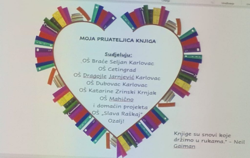 Čestitke Osnovnoj školi Slava Raškaj Ozalj, kao i svim školama partnerima (OŠ Cetingrad, OŠ Katarina Zrinski Krnjak, OŠ Braća Seljan, OŠ Dragojla Jarnjević, OŠ Dubovac, OŠ Mahično) na uspješnoj provedbi projekta „Moja prijateljica knjiga“ pokrenutog u sklopu obilježavanja Mjeseca Hrvatske knjige. Ove godine projekt je posvećen mladima, čija je tema Generacija K, a moto Misli na sebe – čitaj! U projektu je sudjelovalo sedamdeset učenika i osamnaest mentora, a njegova svrha bila je poticanje čitanja i kreativnog izražavanja, razvijanje kritičkog mišljenja o pročitanom djelu te povezivanje i međusobno upoznavanje učenika i učitelja unutar Karlovačke županije. Više možete saznati na sljedećoj poveznici: http://os-slava-raskaj-ozalj.skole.hr/?news_hk=1&news_id=3167&mshow=290#mod_news